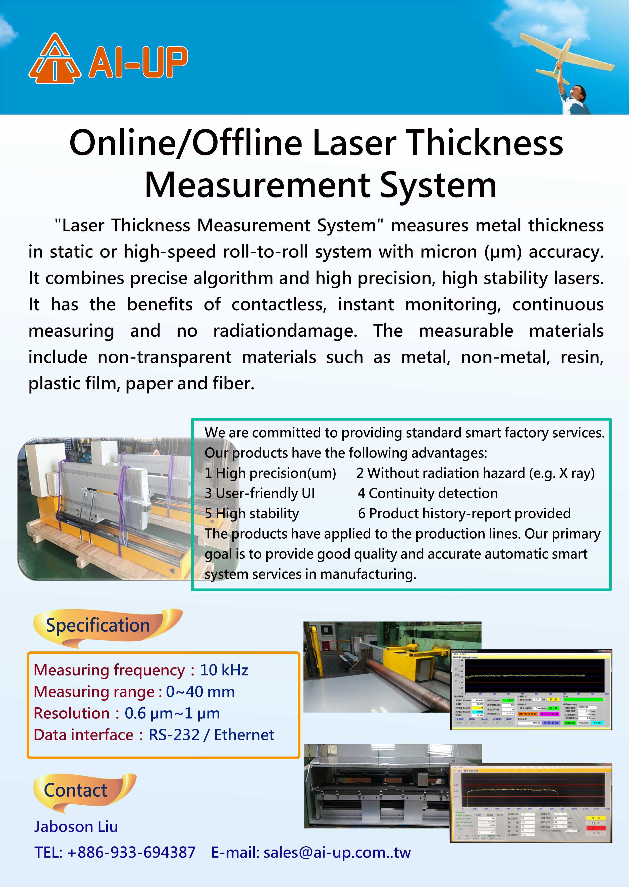 "Portable Laser Thickness Measure System" measures thickness in static with micron (μm) accuracy. It combines precise algorithm and high precision, high stability lasers. It also has the benefits of non-contact, instant monitoring, continuous measuring and no radiation damage. The measurable materials include non-penetrating materials such as metal, non-metal, wafer, resin, plastic film, paper and fiber.